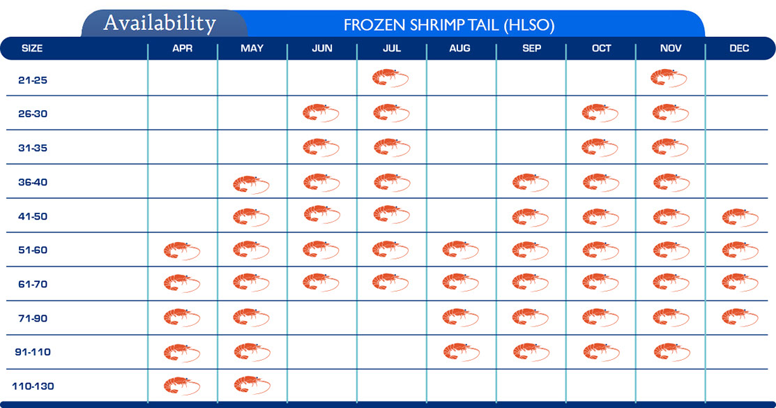 › 30/40, 40/50, 50/60, 60/70, 70/80, 80/100 (N°. of shrimp per / kg).