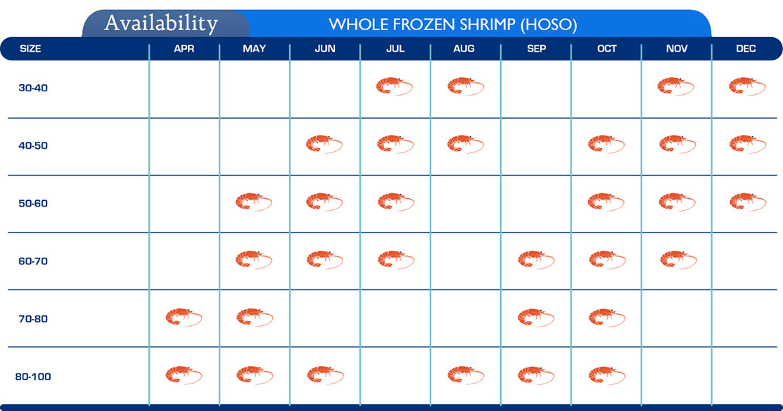 › 30/40, 40/50, 50/60, 60/70, 70/80, 80/100 (N°. of shrimp per / kg).